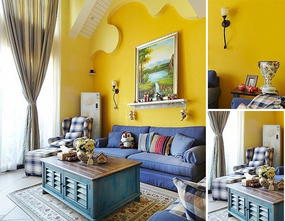 黃、藍(lán)紫和綠系列搭配體系是地中海風(fēng)格辦公室裝修、賓館酒店裝修裝飾等工裝,和家庭辦公室、別墅裝修裝飾等家裝中色彩應(yīng)用率低于藍(lán)白色系列搭配的第二大奇特色彩應(yīng)用,是取自于南意大利向日葵、法國南部薰衣草花田中,金黃色、籃、紫花卉和綠葉相映襯,頗具情調(diào)的色彩組合,所以是又一大自然色彩組合成的地中海風(fēng)格室內(nèi)裝修裝飾色彩應(yīng)用景觀。