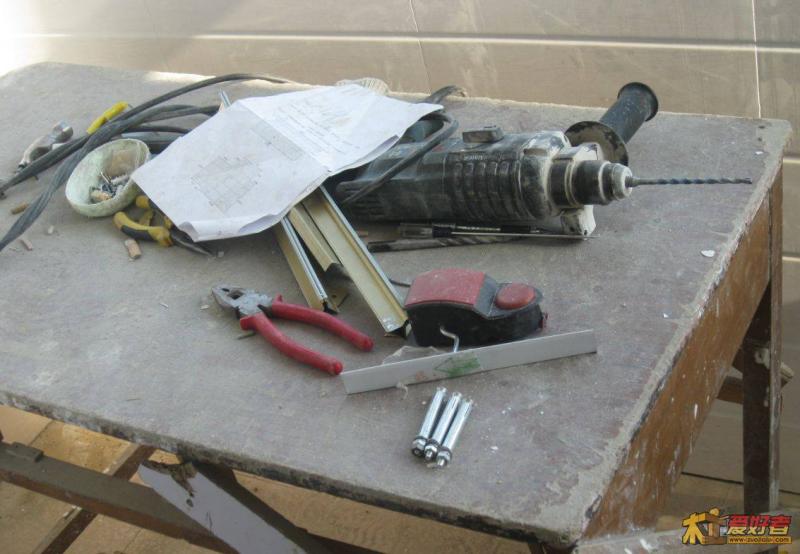 在材料準(zhǔn)備上,既有集成吊頂?shù)哪K等材料,還有全部使用的各種工具,像需準(zhǔn)備的工具就有卷尺(測量長度、高度)、透明水管(墻體水平測量)、墨斗(墻體弾線)、等邊直角三角尺(邊角料等斜邊切割測量)、專用剪刀(材料細(xì)微修剪)、切割機(jī)(切割龍骨、收邊條)、磨光機(jī)(材料毛邊修整)、電錘(墻體打孔)、手槍鉆(龍骨等材料打孔)、金剛鉆頭(瓷磚墻體打孔)等等,共有二十多種工具。