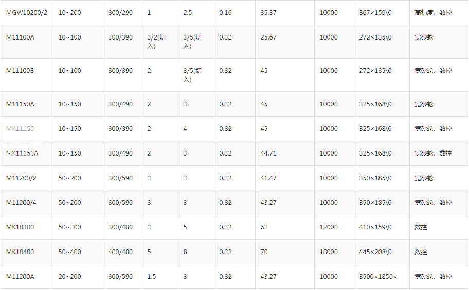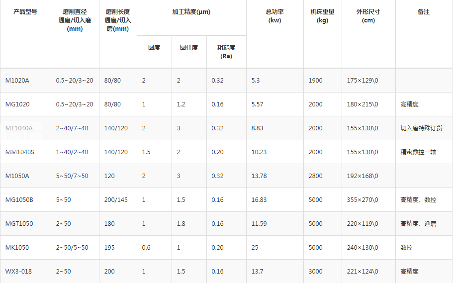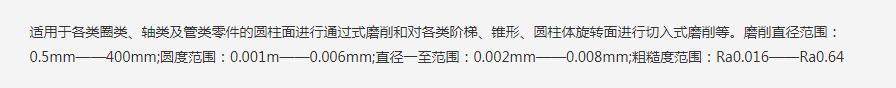 無心磨床:適用于各類圈類、軸類及管類零件的圓柱面進行通過式磨削和對各類階梯、錐形、圓柱體旋轉面進行切入式磨削等。磨削直徑范圍:0.5mm——400mm;圓度范圍:0.001m——0.006mm;直徑一至范圍:0.002mm——0.008mm;粗糙度范圍:Ra0.016——Ra0.64